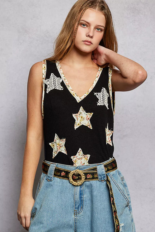 POL Washed Ribbed V-Neck Tank with Floral Print Star Patch