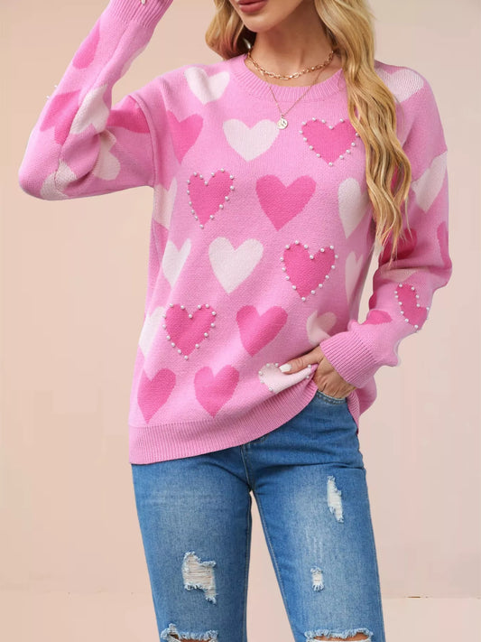 Heart Pattern Beaded Round Neck Sweater